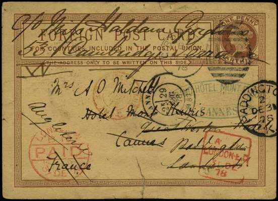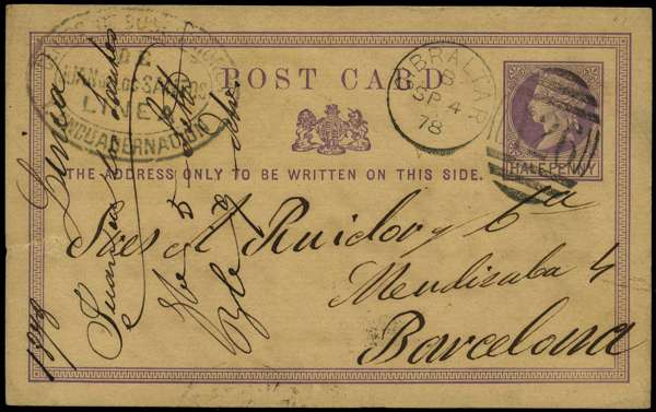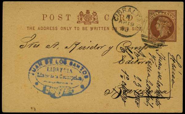 Postal Stationery. 1878-83 three GB postcards, each used from Gibraltar. ½d brown and ½d lilac, each used to Barcelona, and 1¼d Foreign Post Card to Cannes, forwarded to London, this with a crudely repaired tear at base, but scarce
