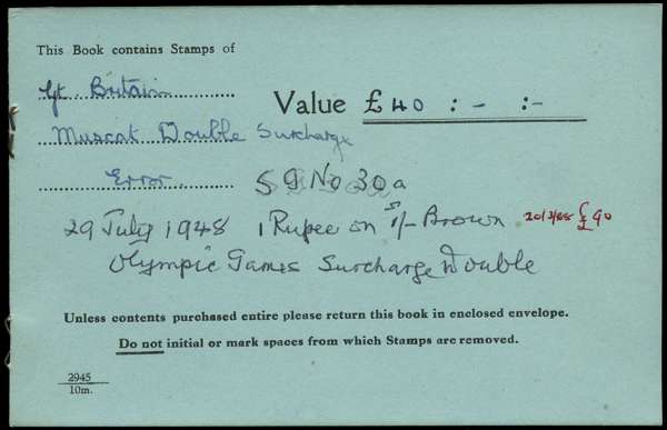 1948 1r on 1/- Olympics right marginal (#78 on the sheet) with surcharge double, fresh unmounted o.g. SG guarantee on reverse, offered with the original approval booklet from SG. SG 30a, £1800