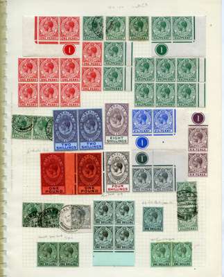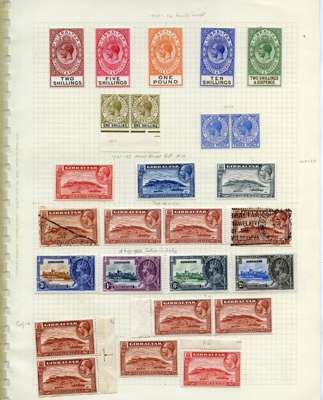 1912-35 mainly mint collection (125) on three busy pages with 1912-24 set to £1 (2), values to 2/- in pairs and/or blocks, with some shades. (Two examples of the £1 in excellent shades, one with minor adhesions on reverse.) 1921-7 Script set less 2½d blue mint, values to 1/- in pairs, also some used; 1925-32 new colours to £1, 1931 Rock set and 1935 Jubilee. The great majority of the mint first hinge and very fresh.