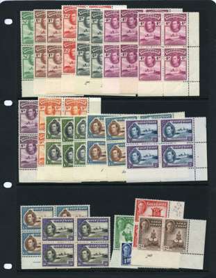 1938-43 set blocks (17 Plate blocks to 2/- including 9d line perf and other unnumbered blocks, plus 1/3d imprint block and 10/- block (blemishes on reverse); 1948 values to 2/- in Plate blocks (27), collected for different numbers and printings, many dated ex the SG reference collection, plus a couple of other pieces including 2/- and 5/- Plate pairs; good lot