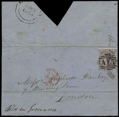 GB USED ABROAD: 1858 large part cover with 6d lilac cancelled with a full “A15” numeral, stamp scissors separated at right and bottom, manuscript mark vertically across, addressed to London, Grenada double-arc c.d.s.(MY 10 1858) and London Paid in red (MY 31 1858), part of the “Hankey” correspondence, SG Z4