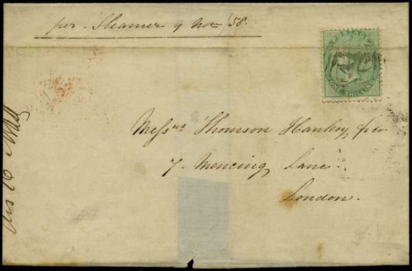 GB USED ABROAD: 1858 large part cover with 1s green with a weak “A15” numeral, horizontal file fold crease affecting the top of the stamp, addressed to London, Grenada double-arc and London datestamps on reverse, part of the “Hankey” correspondence, ex Jaffe, David Pitts, SG Z5