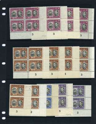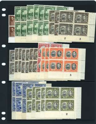 1938-50 Plate blocks, with duplication because collected for printings. ½d (6), 1d (10), 1½d, 2d (3), 2½d (3), 3d (5), 6d (4), 1/- (5 and a pair), 2/- (perf 12½, lightly yellowed paper, mark on reverse of one) and 5/- (2), some dated ex the SG reference collection. SG 152a/162a