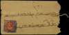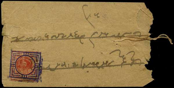 1901 small strung native envelope franked by ½a red (pale shade), tied crisply by boxed cancel in violet, leaving the Raja's portrait clear, couple of small pinholes, otherwise an attractive and rare item. SG 3