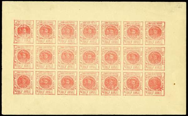 1901 ½a red (pale shade), on wove paper, complete sheet of twenty-one (3x7), showing part of papermaker's wmk, unused, insignificant blemish at lower right, a rarity as a sheet, fine. SG 3, £768+