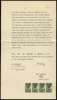 Revenues. 1932 £1 green and black horizontal strip of four on clean (folded) page of document, lightly pen-cancelled. Barefoot 64, T&M 14.1