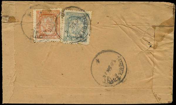 1936 homemade local cover franked with 1935 ¼a salmon and 1933 1a pale turquoise-blue each tied by RIYASAT DUNGARPUR cds for 10 MAY 36 (month slug inverted) in black, with RIYASAT DUNGARPUR arrival mark for 11 MAY 36 in purple on obverse; adhesives affixed over a crease from the envelope's construction and archival puncture to cover, still a rare cover from a private correspondence. Ex Uttama Part I (2020) SG 2a, 4