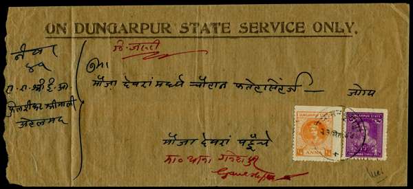 1935 'On Dungarpur State Service Only' pre-printed envelope franked ¼a orange-yellow perf 10½ and 1a3p bright mauve (perf 10) crisply tied by native cds for 23 Sep 1944 in black, with manuscript annotation at top which reads "Jaruri" (Express), and annotation at foot in red ink reads "Thana Gansehpur", cover creased at far left, otherwise a most attractive and rare cover. SG 9c, 12 Ex SGA Uttama Part I (2020)