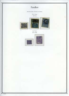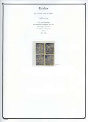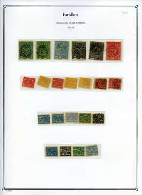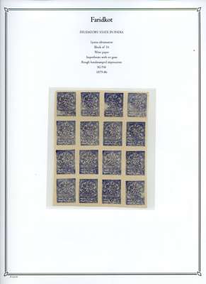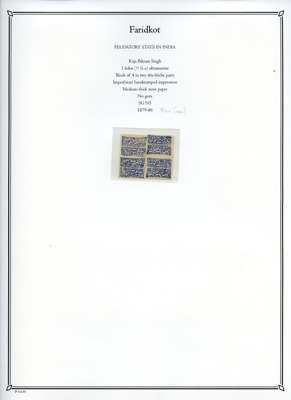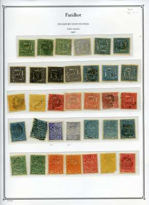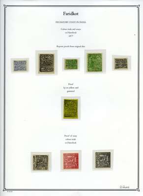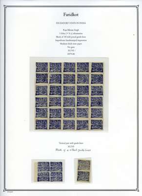 1879-86 unused collection neatly arranged on pages, we note; 1877 reprints and proofs of the first issue, 1879 basic set to 1p ultramarine, 1f ultramarine unused block of 30 with pencil guidelines, 1f ultramarine tête-bêche block of four (SG N5a), 1p ultramarine block of 16 (SG N6), and assortment of later reprints after Faridkot joined the postal convention with the Indian Government in 1887, fair to fine condition.