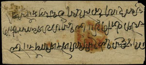 c.1870 handmade native envelope franked by 1a olive-green, single imperf horizontally, tied by large rhomboid of bars cancel, neighboured by two native datestamps in red, adhesive roughly separated, otherwise fine, a very scarce cover. BPA certificate (2019), SG 1b