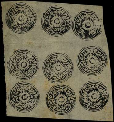 1874-76 ½a deep black special printings in watercolour on native paper, unused block of nine showing irregular spacings, some light tones and creasing, otherwise a scarce multiple. SG 14