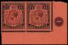 1918 £1 purple and black on red paper Plate 1 pair from lower right corner of the sheet, fine o.g. with first light hinge, folded between. Scarce with Plate number. SG 55, £500