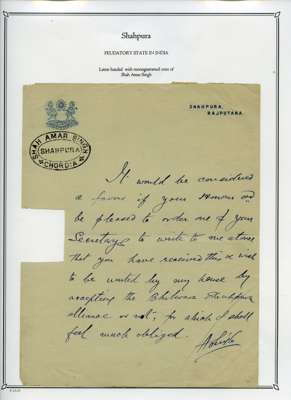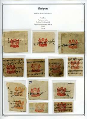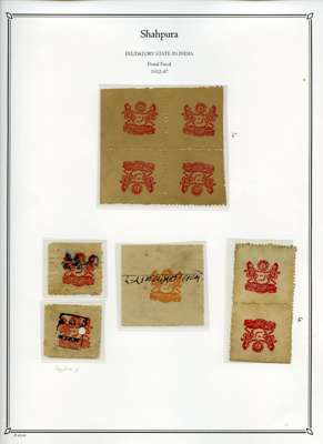 1932-47 selection of Postal Fiscal ½a red (shades) on album leaves, including 16 examples used on fragment piece cancelled in manuscript and a letter from the State showing the monogram of the state and Shah Amar Singh Shahpura state handstamp, mixed condition, still an interesting lot.