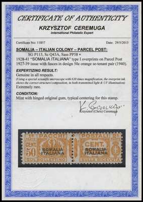 Somalia: 1928/42 50c orange se-tenant Parcel Post pair with “SOMALIA ITALIANA” type I overprint. MLH with usual centering. Ceremuga Cert. (2015) A great Colony rarity. Scott Q43A, Sass PP58, SG P115, Cat. £20,000