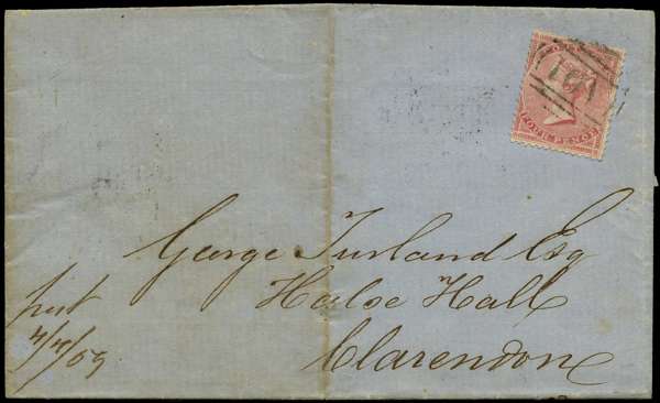 GB USED ABROAD: 1859 Local cover with 4d rose-carmine tied by Kingston "A01" numeral, addressed to Clarendon with arrival c.d.s. on reverse (AP 4 1859), vertical file fold not affecting stamp, ex Dick Hemmings, SG Z4