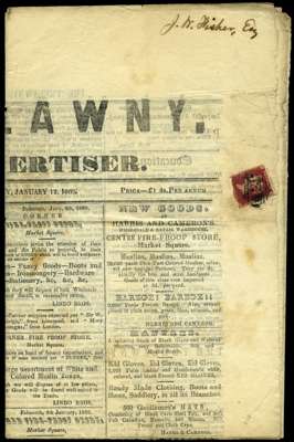 GB USED ABROAD: 1860 The Trelawny Public Advertiser newspaper (JA 12 1860), complete four pages, mailed to Tulloch, Bounty Hall, interesting content, e.g. Report of the Association for Moral and Social Improvement, with 1d rose-red (damaged at base) cancelled with smudged “A39” numeral, SG Z53