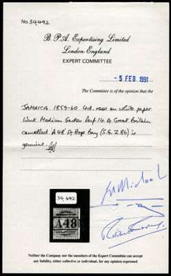 GB USED ABROAD: 1859 Hope Bay “A48” numeral on 4d rose-carmine (straight edge at right), ex Derek Seaton, BPA cert (1991), fine strike, SG Z86