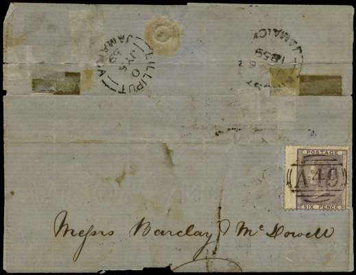GB USED ABROAD: 1859 Lilliput “A49” numeral on 6d lilac wing margin on part local cover addressed to Kingston, Lilliput c.d.s. (JY 5 1859), Kingston c.d.s. (JY 6 1859), lovely strike of “A49”, SG Z90