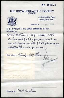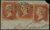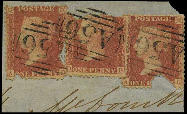 GB USED ABROAD: 1857 Moneague “A56” numeral, clear strikes on damaged trio of 1d rose-reds tied to a piece, ex Derek Seaton, RPS cert (1990), SG Z106