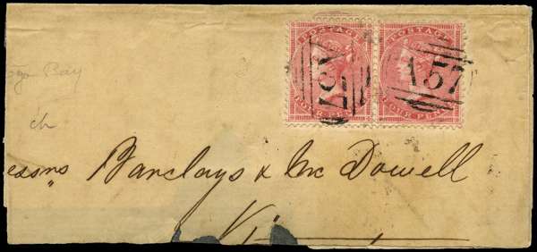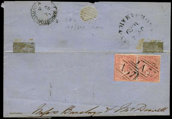 GB USED ABROAD: 1859 Montego Bay “A57” numeral, two pieces with pairs of 4d rose, clear strikes and with additional Montego Bay c.d.s (MY 23 1859 and JY 4 1859), attractive, SG Z110