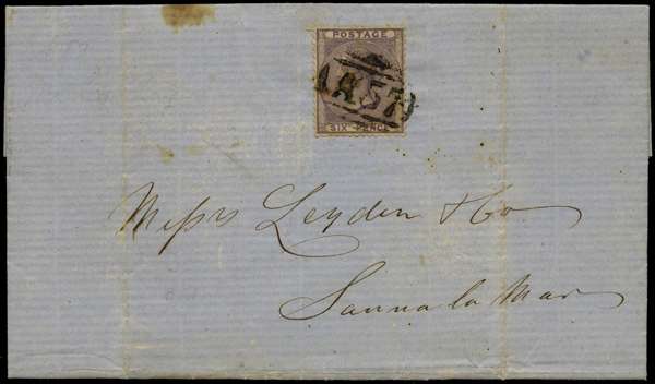 GB USED ABROAD: 1860 Montego Bay “A57” numeral on cover local cover to Savannah La Mar, weak partial Montego Bay cds, letter dated as MY 25 1860, rare use of the 6d rate from Montego Bay, fine, SG Z111