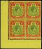 1950 (Aug.) 5/- green and scarlet on yellow chalk-surfaced paper, unmounted o.g. lower left corner block of four. HPFs include #49a sliced scroll, nice fresh block. SG 118g, £240