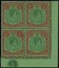 1946 (Dec.) 10/- deep green and dull red on green paper Plate block of four, o.g., hinged on top pair and with some adhesion; fine appearance. SG 119d