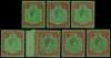 1938-53 10/- reference group per SG listing, mint, with the first three fine hinged mint and the four later unmounted. The line perf stamp has HPF #54 dented scroll. SG 119-f, £225 unmounted and £1100 hinged
