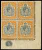 1940 (Oct.) (?) 12/6d grey and pale brownish orange Plate block of four, unmounted o.g. with the usual streaky gum. A rather puzzling block because although the Plate plug state points to Oct. 40, the shade is highly untypical of that printing; thus the printing allocation is tentative. Interesting. SG 120b, £440