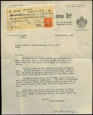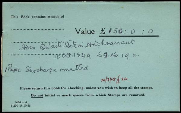 1949 (1r on) 1/- blue, right marginal (#35 in the sheet) with the surcharge omitted, unmounted mint. SG guarantee on reverse. Together with original approval book (!) from SG containing the stamp, priced at £150 in 1950, and letter acknowledging receipt of the remittance. SG 19a, £4000