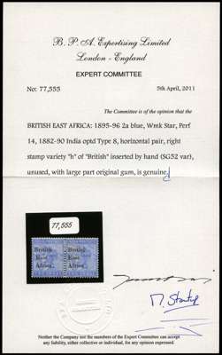 1895-96 2a blue overprinted on India (type 8), horizontal pair, the right stamp variety 'h' of British INSERTED BY HAND' (to correct a broken or partially printed impression of which only the feet remain), fresh large part o.g. The inverted letter is diagonal and in a different (greyish) ink. Tiny gum blemishes and some creasing (insignificant on variety) but a unique and previously unrecorded item, comparable in importance to the 'B handstamped' varieties of the 2r, 3r, 5r of the same issue (= SG 61a, 62a, 63b). [The type and setting of the variety stamp share diagnostic flaws with 'State 4' of the 'Br1tish' variety, which may not actually be from R10/12]. Ex Beauchamp Vialou, with his original notation. BPA Certificate (2011). SG 52 var