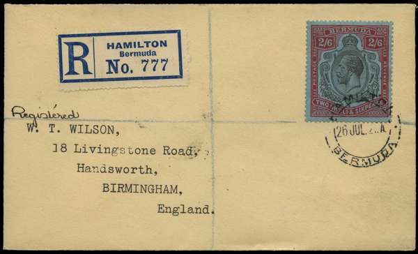 POSTAL HISTORY: 1928 2s6d black and carmine on pale blue tied by Hamilton datestamp (26 JUL 1928) on registered cover to England, receiving cancel on reverse, Birmingham registered oval (8 AU 1928), fine SG 89