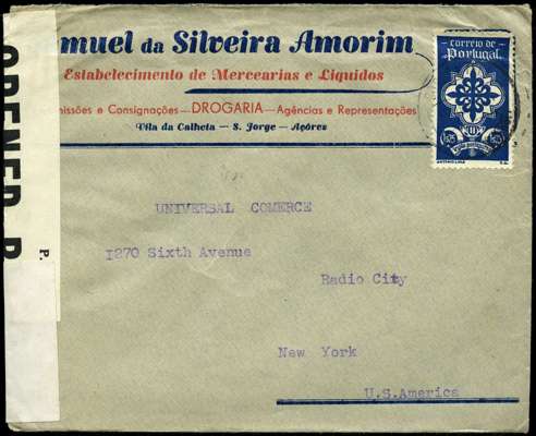 POSTAL HISTORY: 1941 “DETAIN” label applied to Portugal to New York USA surface mail cover sent 18 JU 1941, UK type PC90 censor label, examiner 6127. Miller records only two examples of the “DETAIN” label used in Bermuda, scarce