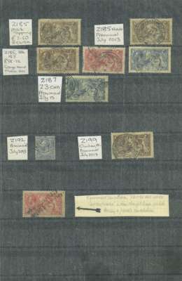 GB used in. 1919-23 BPOs in Constantinople and Smyrna small range including Z185 x 3 (each with perf faults), Z186 and Z187 x 2 (the 10/-s each with minor perf faults); Z199, and a 5/- Seahorse with 'unrecorded' two-line BRITISH POST OFFICE/ CONSTANTINOPLE cancel, possibly a parcel marking. Also a few other odds including from Salonica and Stamboul, mixed condition