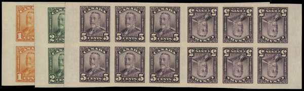 1928-29 1c orange, 2c green, 5c violet, in matching imperforate blocks of 12 (6x2) from uncut booklet sheets, each comprising two panes of 6 (3x2) tete-beche, with 4.5mm central gutter and 'binding margins' at ends, brilliant o.g. Rare and spectacular items in superb condition, each mounted on two stamps only, leaving the central tete-beche blocks unmounted. Unitrade 149c, 150c, 153c.
