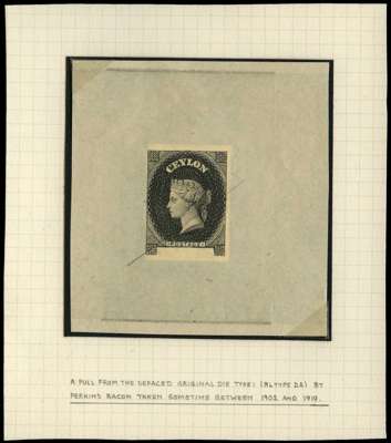 1857 Die Proof in black without value, type 1 used for pence issues, defaced with a manuscript line, taken from the original Perkins Bacon die, ex “Gem Collection of Ceylon” (2021), fine