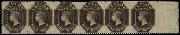 1867-70 9d blackish brown, wmk. crown CC, horizontal marginal strip of six, large part o.g. with a few minor flaws (clipped perfs at top, few minor tone specks), fifth stamp showing the “White Face” variety. Very fine and striking multiple, SG 69b var