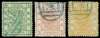 1878 thin paper, 2½mm spacing 1ca green, 3ca brown-red and 5ca orange, each fine used by part Peking seal in blue.