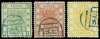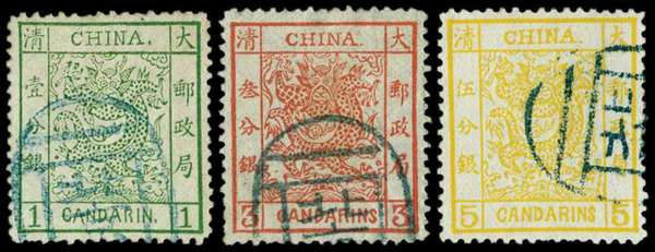 1883 thicker paper, 2½mm spacing, clean-cut perf 1ca green, 3ca brown-red and 5ca chrome-yellow, each used by part Peking seal in blue, 5ca light bend and a couple of short perfs