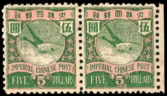 1897 Tokyo Tsukiji Type Foundry ptg, inscribed 'Imperial Chinese Post' $5 yellow-green and rose, horiz pair with small part sheet margin at right, well centred with good perfs, small part o.g.