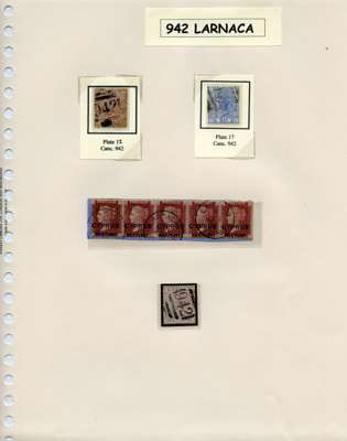 GB Used in Cyprus. 1878-80 Larnaca 942 numeral collection on leaves and card, 29 stamps plus two covers (one poor). Includes a good 2d blue Plate 14 and a 2½d blue Plate 17. Also overprinted Cyprus stamps with SG 2 Plate 208 reconstructed irregular block of 23 (!) and SG 9 Plate 215 fine CDS strip of five. Useful group despite some mixed condition
