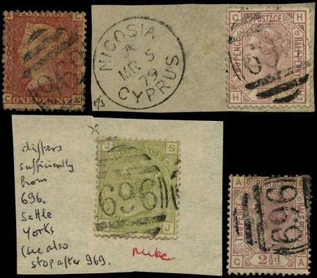 GB Used Abroad; Cyprus. 1864-79 1d rose-red Plate 202; 2½d rosy mauve Plate 13 (on piece with CDS alongside) and Plate 15, and 4d sage-green Plate 15, each with fine or better '696' numeral of Nicosia. SG Z36, 38, 42, £1600