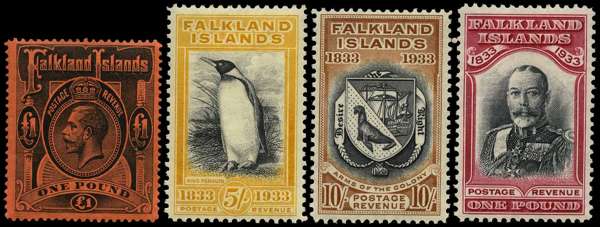1869-1952 mainly mint collection on Lighthouse leaves including black and red frank both on small paper pieces, mint including 1878 6d and 1s, 1882-1902 to 1s with assorted shades, 1898 2s6d, 5s (thin), KEVII to 5s with shades including 1d dull coppery red, 1912-20 to £1 with assorted shades, War Stamps, 1921-29 to 3s with shades, 1929 Whale and Penguin set to £1, 1933 Centenary set to £1, 1935 Silver Jubilee set on cover, 1938 to £1 including two 5s, 1948 RSW £1 and 1952 to £1. A lovely fresh lot, mainly good to fine. (189)