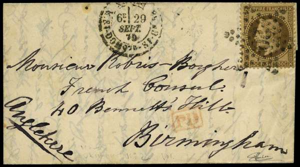 Sixth Balloon of the Siege: 1870 entire letter to Birmingham franked by Napoleon III 30c Empire, cancelled by Paris '20' star cancel, with cds dated 29 sept alongside; carried on the 'Armand Barbes' which departed on the 7th October, backstamped by Birmingham arrival mark for OC 13, very fine.