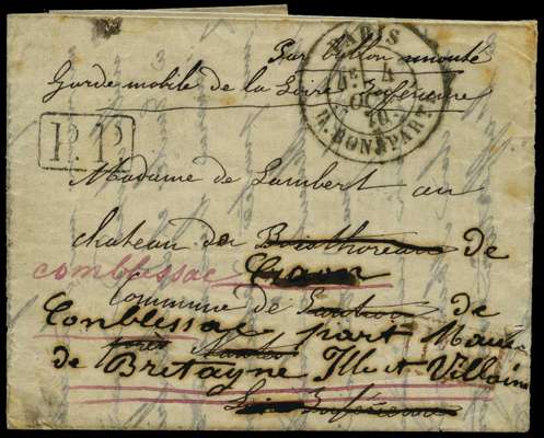 Sixth Balloon of the Siege: 1870 small entire letter to Nantes with little room for a stamp to be affixed hence the use of boxed P.P handstamp denoting payment had been received, with Paris R. Bonaparte cds for 4 Oct, carried by 'Armand Barbes' which departed on the 7th Oct, cover was re-addressed on arrival and forwarded to Maure with numerous transit marks on reverse, some light tones, still an attractive item.