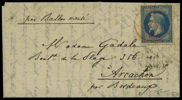 Ninth/Tenth Balloon of the Siege: 1870 entire letter to Arcachon, Bordeaux franked by Napoleon III 20c Empire, tied by red official Paris (SC) cds for 6 Oct, carried on either the 'Washington' or 'Louis Blanc' Balloons which departed Paris on 12th Oct at 8am and 9am respectively, with Bordeaux arrival mark for 16 Oct, most attractive.