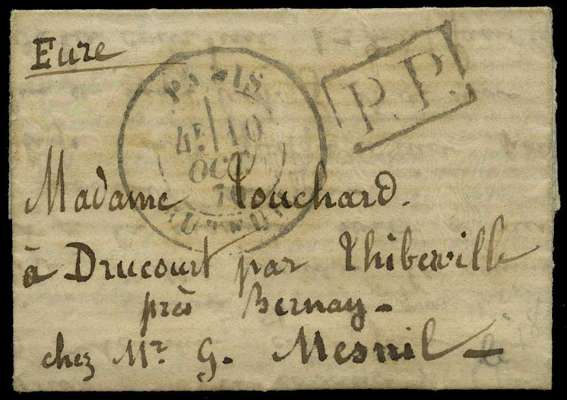 Ninth/Tenth Balloon of the Siege: 1870 miniature entire letter to Bernay, with boxed P.P. paid mark and Paris Auteuil cds for 10 Oct, carried on either the Washington or Louis Blac Balloons which departed on 12th Oct at 8am and 9am respectfully, backstamped with Eure and Bernay arrival marks for 18 Oct, a fine and unusual item, certainly the one of the smallest piece of mail carried during the siege, offered with English translation of contents.