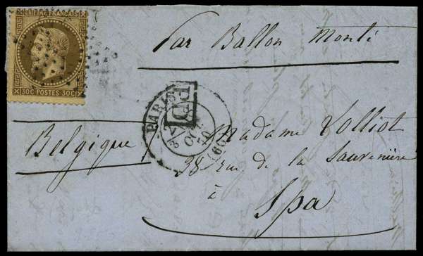 Sixteenth Balloon of the Siege: 1870 entire letter to Spa, Belgium, franked by Napoleon III 30c Empire, tied by Star mark, with Paris (60) cds for 18 Oct, carried by the Balloon 'La Fayette' reverse bearing fine strike from Spa arrival ds for 21 Oct, very fine.