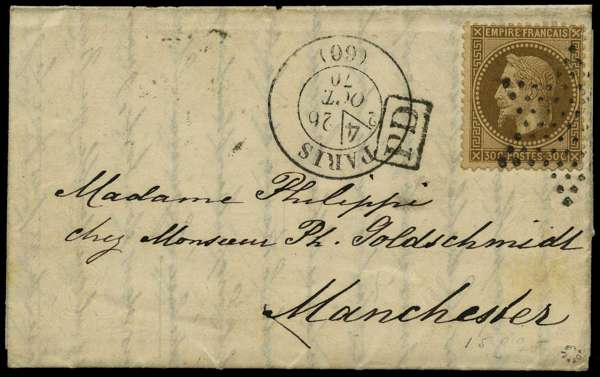 Nineteenth Balloon of the Siege: 1870 entire letter to Manchester, England, franked by Napoleon III 30c Empire, tied by Star mark and Paris (60) cds for 26 Oct, carried on the Balloon 'Vauban' which departed Paris on 27 Oct, with crisp Manchester arrival mark for 2 Nov, very fine.