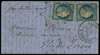 Twenty-first Balloon of the Siege: 1870 entire letter to Jersey, Channel Islands, franked by two Ceres 20c Republic (over paying the overseas rate by 10c!), tied by Star marks with Paris Rue Bonaparte cds for 28 Oct, carried by the Balloon 'Colonel Charras' which departed Paris on 29 Oct, backstamped with Jersey arrival d/s for Nov 3, some filing folds, still very fine.